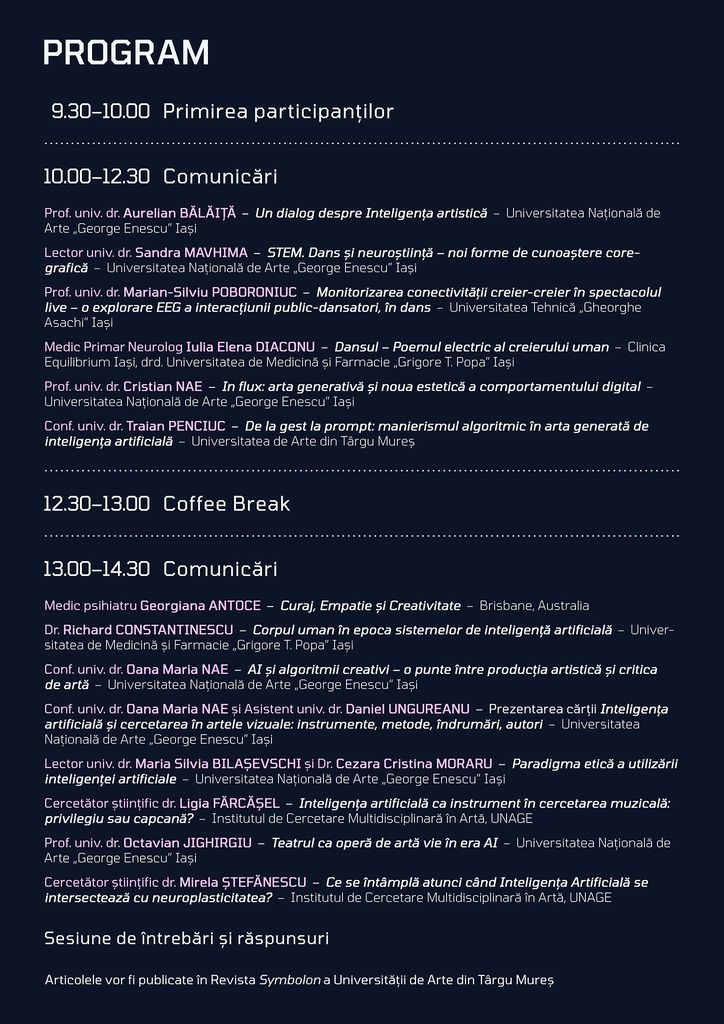 Institutul de Cercetare Multidisciplinară în Artă din cadrul Universității Naționale de Arte „George Enescu” din Iași, organizează în data de 7 noiembrie 2025, începând cu ora 10.00, la Sala Studio Muzică „Anton Diaconu” (Corp Artes UNAGE, Str. Costache Negruzzi nr. 7-9), Conferința Științifică Neuroplasticitatea în Era Digitală – Impactul Inteligenței Artificiale asupra Creativității, derulată prin grantul ICMA-UNAGE, 2025, manager proiect, Cercetător Științific dr. Mirela Ștefănescu, în parteneriat cu Universitatea de Medicină și Farmacie „Grigore T. Popa” din Iași, Universitatea Tehnică „Gheorghe Asachi” din Iași și Asociația Secția de Coregrafie din București.