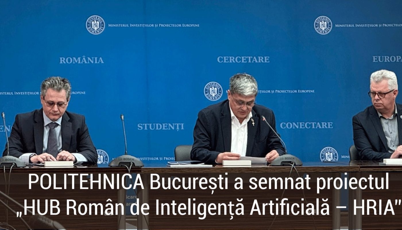 Universitatea Națională de Știință și Tehnologie POLITEHNICA București a semnat astăzi, la Ministerul Investițiilor și Proiectelor Europene, proiectul „HUB Român de Inteligență Artificială – HRIA”, o inițiativă de referință în cadrul Programului Creștere Inteligentă, Digitalizare și Instrumente Financiare 2021-2027 (PoCIDIF). Cofinanțat prin Fondul European de Dezvoltare Regională (FEDR), HRIA își propune să transforme România într-un pol de excelență în domeniul inteligenței artificiale, conectat la tendințele globale.